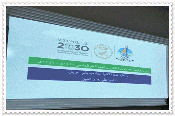 أقامت وحدة العلاقات العامة والإعلام ووحدة الأنشطة الطلابية في الكلية الجامعية بأبي عريش ممثلة في رئيسات الوحدات أ.فردوس الحربي و أ.نجوان حرازي، يوم الأربعاء الموافق 1442/1/7هـ برنامج بعنوان (تهيئة أعضاء هيئة التدريس الجدد للعام الجديد١٤٤١هـ - ١٤٤٢هـ) بحضور عميدة الكلية د. آسيا علي حيدر الشيخ، ووكيلة الشؤون الأكاديمية د. الشيماء حمودة، ووكيلة التطوير أ. نور العطاس، وبحضور مجموعة من أعضاء هيئة التدريس ورئيسات الأقسام بالكلية.