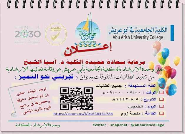 ضمن فعاليات الإرشاد الأكاديمي بالكلية وفي إطار اهتمام الكلية بالإرشاد الأكاديمي بالطالبات ،عقدت وحدةالإرشاد بالكلية فعالية بعنوان (تجربتي نحو التميز) برعاية سعادة عميدة الكلية د. آسيا علي حيدر الشيخ وتنسيق منسقة الوحدة أ.سهام عايل الأمير وتنفيذ الطالبات المتفوقات من مختلف الأقسام الأكاديمية وذلك يوم الخميس الموافق 05/08/1442هـ وذلك لعرض تجاربهن الناجحة عبر منصة زوم .