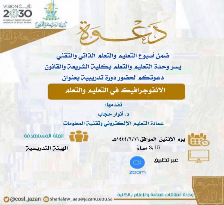 عناية بالدور التقني في الارتقاء بالتعليم والتعلم، نظمت وكالة كلية الشريعة والقانون للبحث والتطوير، ممثلة في وحدة التعليم والتعلم، دورة تقنية بعنوان: "الانفوجرافيك في التعليم والتعلم" وذلك يوم الاثنين ١٦/ ٦/ ١٤٤٤ في الساعة الثامنة مساءً عن بعد (زووم). وذلك بالتعاون مع عمادة التعليم الإلكتروني وتقنية المعلومات.