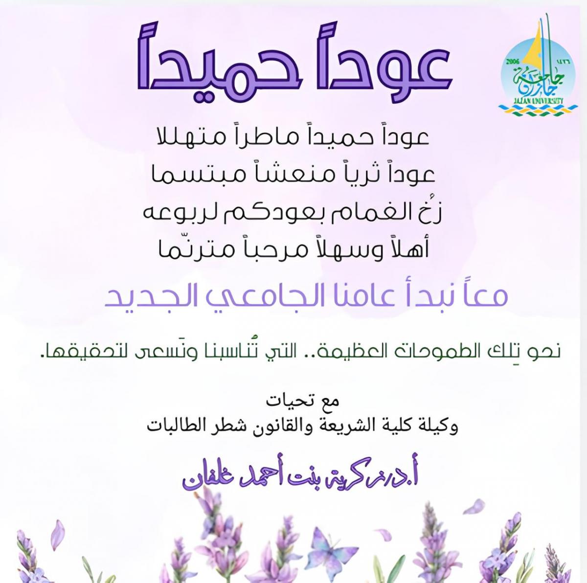 وكيلة كلية الشريعة والقانون ترحب بجميع منسوبات الكلية متمنية للجميع عاماً حافل بالإنجاز والنجاح