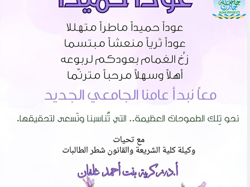 #عوداً_حميداً الزملاء والزميلات أعضاء هيئة التدريس وجميع منسوبات #كلية_الشريعة_والقانون يسرني أن أرحب بكم في بداية الفصل الدراسي الأول من العام الجامعي 1446هـ مثمنة كل الجهود التي تبذل في خدمة الجامعة وكيلة كلية الشريعة والقانون الأستاذ الدكتور زكرية بنت احمد زكري..