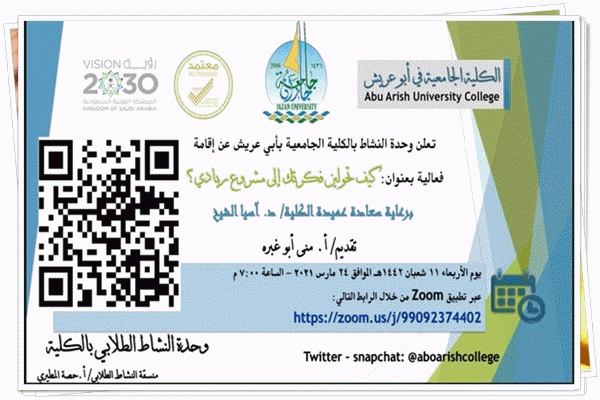 نفذت وحدة النشاط الطلابي بالكلية و تحت إشراف عميدة الكلية الجامعية بأبي عريش د. آسيا علي حيدر الشيخ ورشة تدريبية بعنوان(كيف تحولين فكرتك إلى مشروع ريادي) وذلك يوم الاربعاء الموافق 1442/08/11 هـ الساعة7مساءً عبر منصة زوم، بحضور عدد من أعضاء هيئة التدريس والطالبات من مختلف أفسام الكلية .
