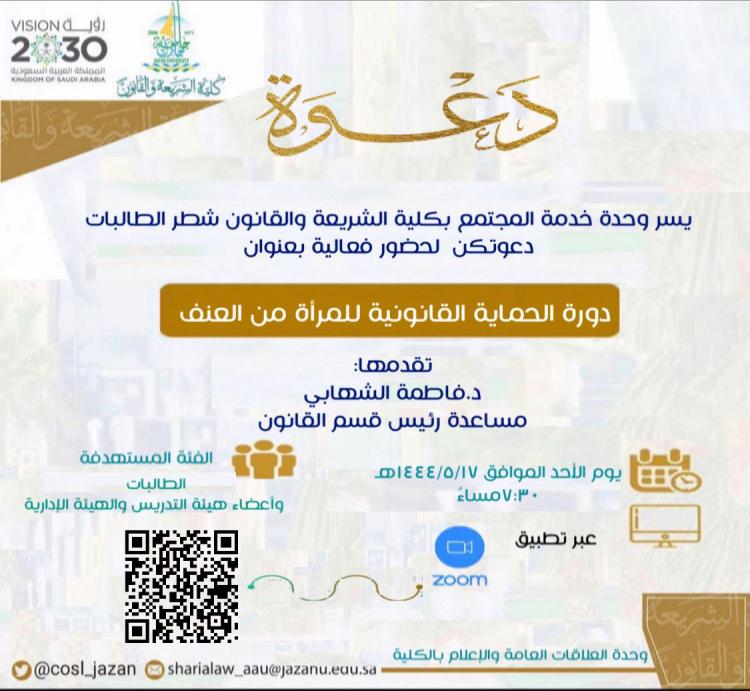 دورة بعنوان "دورة الحماية القانونية للمرأة من العنف" قدمتها مساعدة رئيس قسم القانون بالكلية سعادة الدكتورة فاطمة بنت محمد الشهابي والتي تهدف من خلالها إلى تعزيز الثقافة المجتمعية الرافضة لكافة أشكال العنف ضد المرأة، وحمايتها من خلال التوعية