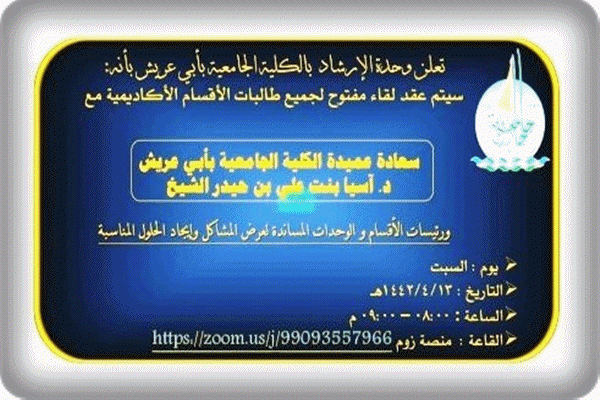 أقامت وحدة الإرشاد بالكلية الجامعية بأبي عريش بتنسيق منسقة الوحدة أ.سهام عايل الأمير لقاءً مفتوحًا لجميع طالبات الكلية مع سعادة عميدة الكلية د. آسيا علي حيدر الشيخ يوم 1442/4/13هـ عبر منصة الـ Zoom بهدف معايشة الأوضاع الأكاديمية للطالبات.