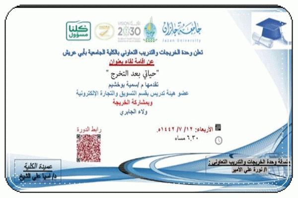 نفذت وحدة الخريجات والتدريب التعاوني بالكلية فعالية بعنوان (حياتي بعد التخرج) وذلك يوم الأربعاء 1442/7/12هـ. بحضور عميدة الكلية د. آسيا علي الشيخ ووكيلة الكلية للشؤون الأكاديمية د. الشيماء حمودة قدمتها م. سمية بوخشيم المحاضرة (بقسم التسويق والتجارة الالكترونية)، وبتنسيق وإشراف من منسقة الوحدة أ.نورة الأمير. استهدفت الدورة جميع الطالبات المتوقع تخرجهن في مختلف أقسام الكلية، وتضمنت عدة محاور كالتالي :