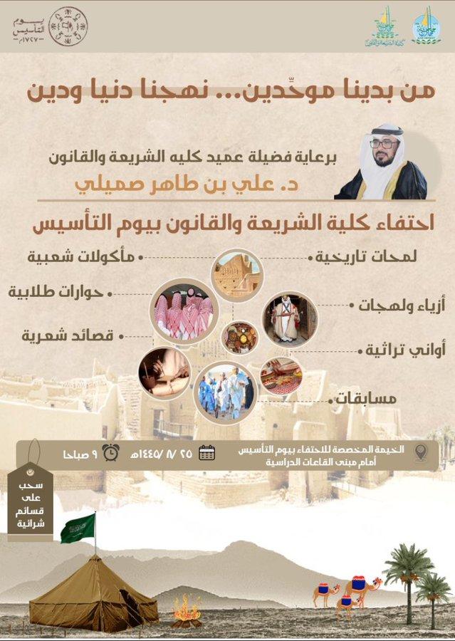 *من بدينا موحدين.. نهجنا دنيا ودين* برعاية فضيلة عميد كلية الشريعة والقانون تدعوكم الكلية غدا الأربعاء لحضور احتفائها بيوم التأسيس - لمحات تاريخية - حوارات طلابية - أزياء ولهجات - مأكولات شعبية - أواني تراثية - قصائد شعرية - مسابقات المكان: الخيمة المخصصة