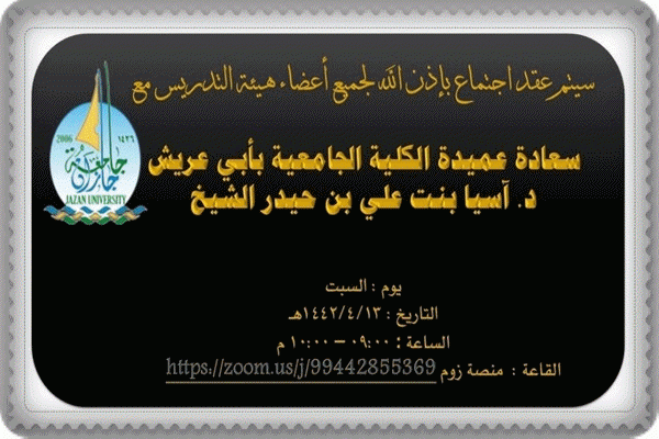 عقدت وحدة الإرشاد بالكلية الجامعية بأبي عريش بتنسيق منسقة الوحدة أ.سهام عايل الأمير, وسكرتيرة مكتب العميدة أ.ذهبة احمد سلامي اجتماعًا للوكيلات ورئيسات الأقسام و أعضاء هيئة التدريس مع سعادة عميدة الكلية د. آسيا علي حيدر الشيخ يوم السبت الموافق 1442/4/13هـ عبر منصة الـ Zoom بهدف توضيح طبيعة ومتلطبات الاختبارات النهائية ، كما أكدت سعادة العميدة د/ آسيا الشيخ ، على جميع الأعضاء بمرعاة الطالبات والتواصل معهم لحل أي مشكلة تواجههم قبل بداية الاختبارات النهائية ...