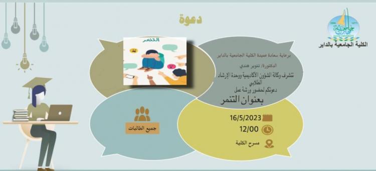 قدمت وكالة الشؤون الأكاديمية ممثلة في وحدة الإرشاد الطلابي في الكلية الجامعية بالداير ورشة عمل عن التنمر بمسرح الكلية قدمتها د. سعاد عبدالله النصري.