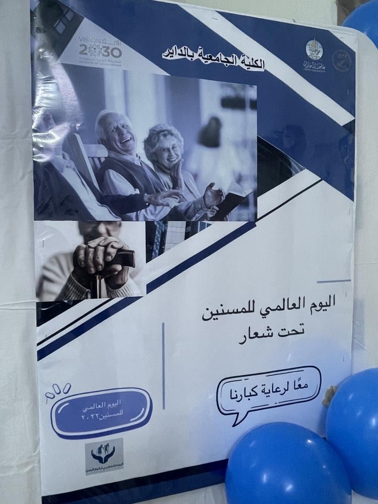 تحت رعاية سعادة عميدة الكلية الجامعية بالداير الدكتورة تنوير هندي نفذ قسم التمريض بالتعاون مع وحدة النشاط الطلابي فعالية لرعاية المسنين تحت شعار (معا لرعاية كبارنا ) تزامنا مع اليوم العالمي للمسنين واحتوت الفعالية علي بوسترات ومنشورات والفعالية سلطت الضوء علي الصحة النفسية , الصحة البدنية , صحة العيون , التغذية , السلامة . وشَرف الفعالية حضور لفيف من أعضاء هيئة التدريس وطالبات واداريات حيث تضمن البرنامج توزيع مطويات تثقيفية عن رعاية المسنين ومن ثم توزيعات تحمل شعار البرنامج وتخلل البرنامج فيديوهات عن رعاية المسنين. تأتي هذه الفعالية كواحدة من الخدمات المجتمعية التي تعنى بها إدارة الكلية للحفاظ على صحة وسلامة أفراد المجتمع , وتعزيزا لأنماط الحياة الصحية , والتخفيف من العبء المرضى تماشيا مع مبادرات منظومة الصحة في البرنامج الوطني للتحول ورؤية المملكة 2030 م. |