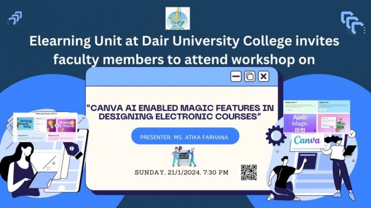 أقامت وحدة التعليم الإلكتروني في كلية الدير الجامعية ورشة عمل إلكترونية بتاريخ 21/1/2024 الساعة 7:30 مساءً حول موضوع " الميزات السحرية لتطبيق كانفا المعززة بالذكاء الاصطناعي في تصميم المقررات الدراسية الإلكترونية " لأعضاء هيئة التدريس قدمتها الدكتورة عاتكة فرحانة. وكان الهدف من هذه الورشة هو لتقديم تطبيق كانفاو إنشاء دروس تفاعلية باستخدام ميزات الذكاء الاصطناعي التي تدعم التطبيق.