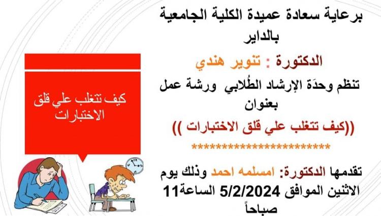 ضمن الخطة التنفيذية لعمادة شؤون الطلاب وتحت رعاية سعادة عميدة الكلية الجامعية بمحافظة الداير الدكتورة تنوير احمد هندي قدمت وحدة الارشاد الطلابي بالكلية الجامعي بالداير ورشة عمل بعنوان كيف تتغلب علي قلق الامتحان وذلك يوم الاثنين الموافق 5/2/2024م قدمتها دكتورة /ام سلمه احمد تضمنت الورشة عدة محاور اولها تعريف القلق وتحدثت عن كل ما يثير القلق وقت الاختبارات كما بينت الفرق بين الخوف والقلق, وذكرت أنواع القلق. وتم التعريف بقلق الامتحانات حيث ان خوف الطالب من النتائج والعواقب الناتجة عن الامتحان يحدث عنه اضطرابات عصبية وحركية وأعراض جسمية. كما تحدثت عن أساليب علاج قلق الامتحان والاشياء التي يجب علي الطالب الامتناع عنها واستخدام عادات استذكار مناسبة قرب الامتحان والاسترخاء وإعطاء الجسم ما يستحق من الراحة واستخدام أسلوب التشجيع وإعادة الثقة بالنفس والشعور بالأمن وتغيير سلوك البيئة الأسرية المحيطة بالطالب أثناء الامتحانات.