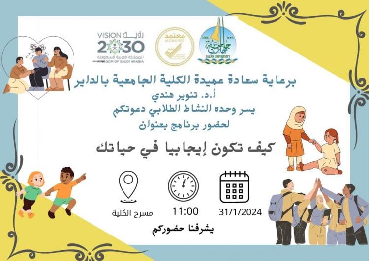 تحت رعاية كريمة من سعادة عميدة الكلية أ.د. تنوير أحمد هندي نظمت وحدة النشاط الطلابي بالتعاون مع قسم الرياضيات برنامج بعنوان "كيف تكون ايجابيا ".واشتمل البرنامج على محاور عديدة منها ,مفهوم الإيجابية – كيف تصبح شخصا ايجابيا – ما هو التفكير الإيجابي وأهميته في الحياة –فوائد ان تكون إيجابي– المسلم والإيجابية.تخلل البرنامج توزيعات تعبر عن البرنامج .لقد حاز البرنامج على رضا الجميع . ختمت رئيسة وحدة النشاط الطلابي أ/ رشا أحمد الفعالية بكلمة شكر لجميع الطالبات على مشاركتهن الفعالة في إثراء هذا البرنامج وعبرت عن شكرها لكافة المشاركات والحضور .