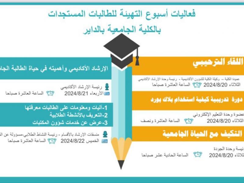 حرصاً من سعادة عميدة الكلية الجامعية بالداير على حسن تهيئة الطالبات المستجدات للاندماج في الحياة الجامعية قدمت وحدة الإرشاد الطلابي برنامج تهيئة للطالبات المستجدات للفصل الدراسي الأول للعام 1446هـ. ففي اليوم الأول الثلاثاء الموافق 16/2/1446هـ استهل البرنامج بكلمة ترحيبية للطابات المستجدات من قبل سعادة عميدة الكلية أ.د تنويرهندي متمنية لهن النجاح والتوفيق في مسيرتهن الجامعية وأكدت لهن أنها وجميع الطاقم الأكاديمي والإداري في الكلية مسخرات لمساعدتهن ليكن الأفضل في جميع النطاقات وتلا ذلك كلمة رئيسة وحدة الإرشاد الطلابي د. أم سلمه أحمد مباركة لهن قبولهن في الكلية الجامعية بالداير متمنية لهن النجاح والتوفيق كما عرفت بكل من الطاقم الأكاديمي والإداري. تلا ذلك تنظيم دورات تدريبية لنظام البلاك بورد وتم شرح كيفية استخدام البلاك بورد وكيفية التعامل مع المحاضرات والواجبات والاختبارات كما تم توضيح كيفية تفعيل البريد الإلكتروني وكيفية استرجاع كلمة السر من قبل د . آسيا سليمان. ثم قدمت د.فاطمة عبدالله محاضرة عن "تهيئة الطالبة للحياة الجامعية" حيث شرحت الآليات الكفيلة بمواجهة الصعوبات الاكاديمية ومتغيرات الحياة الجامعية في اليوم الثاني قدمت رئيسة وحدة الإرشاد الطلابي د. أم سلمه أحمد ورشة عمل بعنوان "أساسيات الإرشاد الطلابي وطرق التعامل مع الطالبات" ووضحت أهمية الإرشاد الطلابي للطالبة الجامعية وأهدافه ومختلف مجالاته ودوره في مساعدة وتوجيه الطالبات في مجالاتهن الحياتية كما تطرقت الى الدور التكميلي لكل من المرشدة والطالبة في إنجاح العملية الإرشادية.