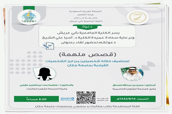 إيمانًا بأهمية النجاح في حياة كل إنسان والدور الذي تلعبه قصص الناجحين في مسيرة الجيل الناشئ، وإيماناً يوجود قصص واقعية ملهمة لأشخاص بدأوا من الصفر. نظمت الكلية الجامعية بمحافظة أبو عريش برعاية سعادة عميدة الكلية د. آسيا علي حيدر الشيخ لقاء بعنوان (قصص ملهمة) استضافت خلاله صفحات مشرقة ونماذج رائدة من جامعة جازان. حيث تم استضافة كلاً من وكيل الجامعة للشؤون الأكاديمية د. حسن بن عبدالله إسحاق، ووكيلة الجامعة لشؤون الطالبات د. فاطمة عبدالعزيز عقيلي.