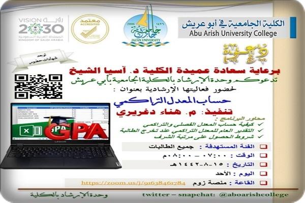 ضمن فعاليات الإرشاد بالكلية الجامعية بأبي عريش وفي إطار اهتمام الكلية بالإرشاد الأكاديمي للطالبات نفذت وحدةالإرشاد بالكلية الجامعية برعاية سعادة عميدة الكلية د. آسيا علي حيدر الشيخ فعالية بعنوان (حساب المعدل التراكمي) بتنسيق منسقة الوحدة أ.سهام عايل الأمير وتنفيذ المحاضرة هناء دغريري يوم الأحد الموافق 15-8-1442هـ عبر منصة زوم.