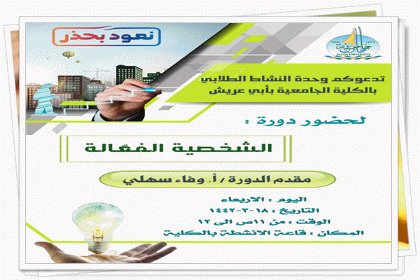 أقامت وحدة النشاط الطلابي بالكلية دورة تدريبية عن "الشخصية الفعالة" قدمتها أ. وفاء سهلي يوم الأربعاء الموافق 1442/3/18هـ في تمام الساعة الحادية عشر صباحا بقاعة الأنشطة الطلابية داخل الكلية مع مراعاة جميع الإجراءات الاحترازية أثناء التواجد داخل القاعة.