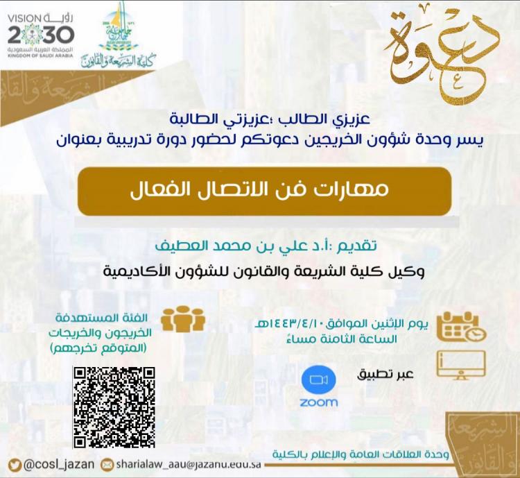 نفذت وحدة شؤون الخريجين دورة بعنوان مهارات فن الاتصال الفعال قدمها فضيلة الأستاذ الدكتور علي بن محمد العطيف وكيل كلية الشريعة والقانون للشؤون الأكاديمية، تناول فيها بتعريف مفهوم الاتصال، مستدلاً بنصوصِ من القرآن والسنة التي تبين الأسس والأصول في هذا المجال، وتحديد العوامل المؤثرة في الانصال وعرض كيفية تحقق الاتصال الفعال في الحديث والإنصات، والصفات التي تكون سببًا في اتصالٍ غير ناجح،وتوضيح 26 مهارة يتحقق بها الاتصال الفعال، مبيّنًا معنى كل مهارة وشواهدها وتطبيقاتها الحياتية وأمثلتها والصفات التي تخالفها،لكي يستفيد منها الطالب في حياته الجامعية وسوق العمل اشتملت الدورة على عرض مرئي ومناقشات جماعية .