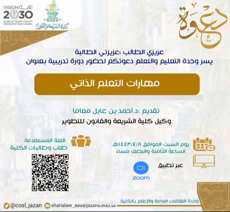 نفذ فضيلة الدكتور أحمد بن عايل معافا وكيل الكلية للتطوير بكلية الشريعة والقانون دورة تدريبية عن مهارات التعلم الذاتي ضمن خطة برامج وحدة التعليم والتعلم، تناول فيها أهداف الدورة ومحاورها وتساؤلاتها، وبين أهمية التوجه العقلي السليم في بناء شخصية الطالب الجامعي للوصول للتعلم الذاتي، ومحددات هذا التوجه، والأفكار غير السليمة في التعامل مع الحياة الجامعية والمقررات، وعرض مهارات التعلم الذاتي وتطبيقاتها، وأسس التعلم الذاتي وأسئلتها، وكيف يمكن للطالب الاستفادة من هذه المهارات في التعامل مع المقررات الدراسية مهما كانت درجة صعوبة المقرر ليصل للتعلم الذاتي ،وقد اشتملت الدورة على عرض مرئي ومناقشات جماعية .