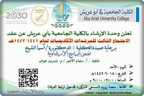 عقدت وحدة الإرشاد بالكلية الجامعية بأبي عريش الاجتماع الثالث بالمرشدات الأكاديميات برعاية سعادة عميدة الكلية: د. آسيا علي الشيخ وحضور وكيلة الكلية للشؤون الأكاديمية د. الشيماء حمودة وتنفيذ منسقة الوحدة: أ. سهام عايل الأمير ومساعدة الوحدة: م. نسرين عوض الطاهر يوم الأحد 18-6-1442هـ الساعة 7-9 مساءً عبر منصة زوم.
