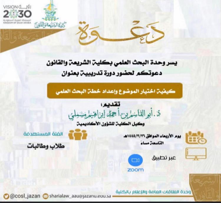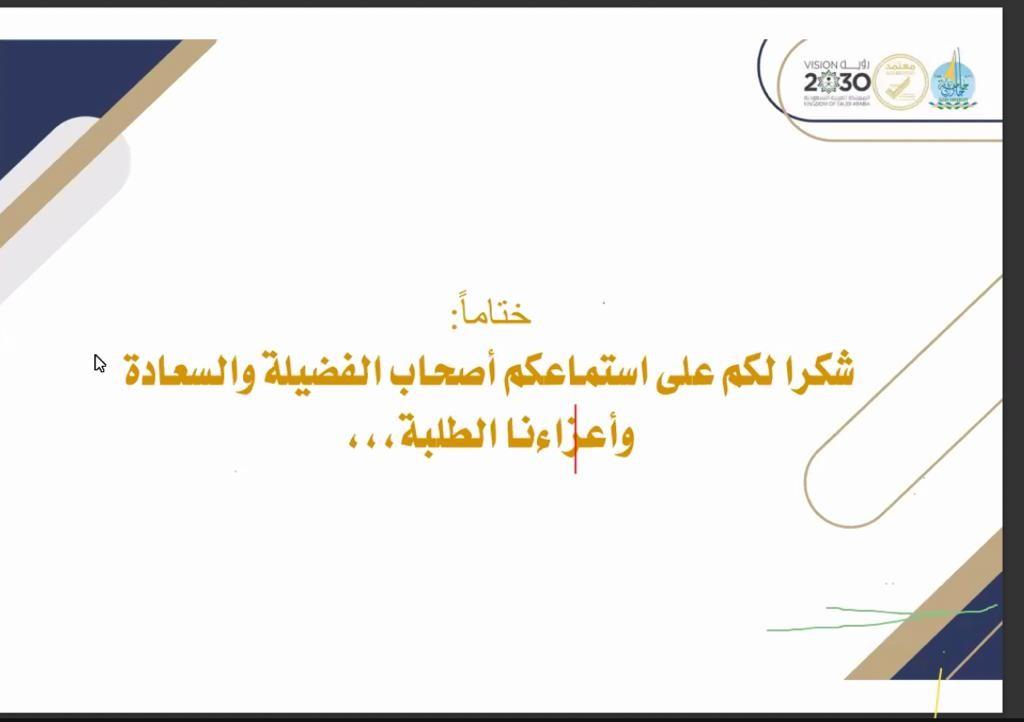 ثم بدأ عرض المادة العلمية بشرائح بوربوينت – مع التمثيل والتوضيح لطرق اختيار موضوع البحث , وضوابطه , والمشكلات التي تواجه الطلاب , وكيفية حلها , وما يجب مراعاته عند اختيار المواضيع البحثية شارك فضيلة وكيل الكلية للبحث والتطوير د. أحمد معافا بكلمة توجيهية عن أهمية مثل هذه اللقاءات وما لها من أثر في تحقيق أهداف البرامج في هذه الكلية والتي يتطلع إليها الجميع .