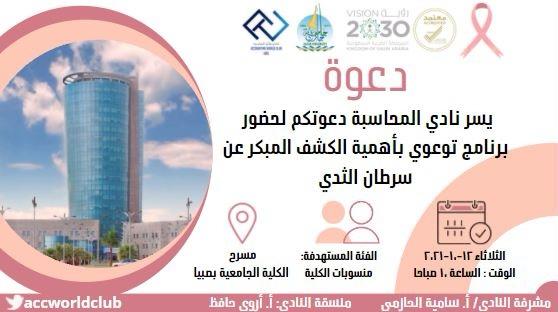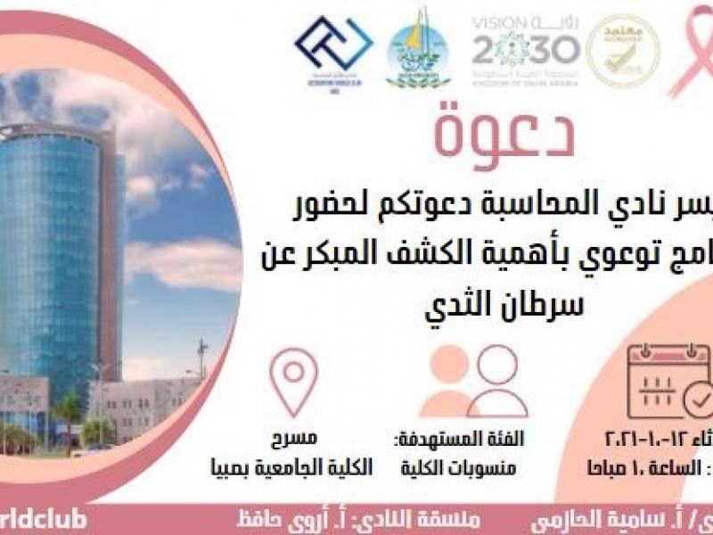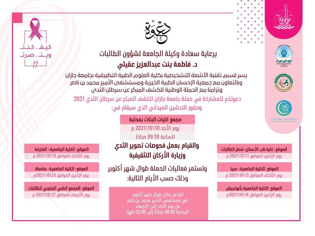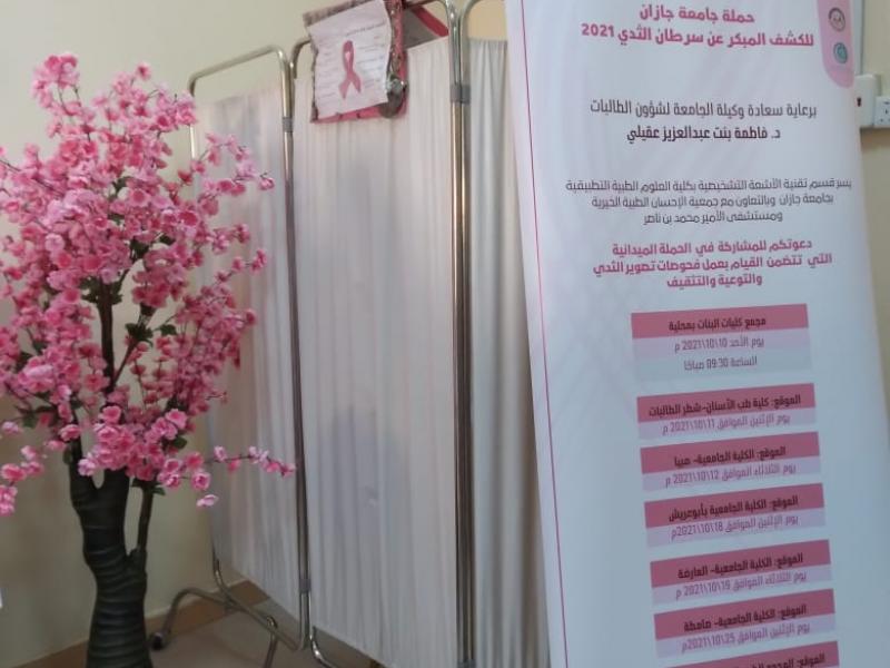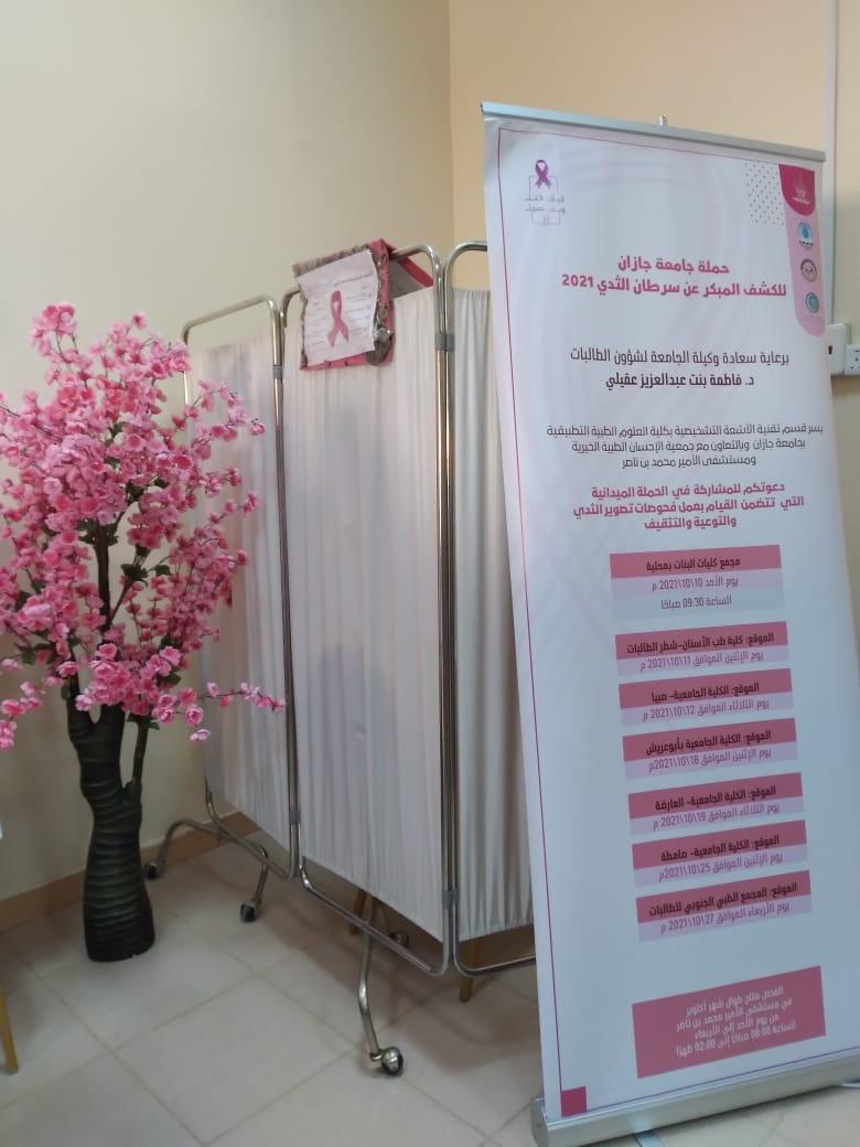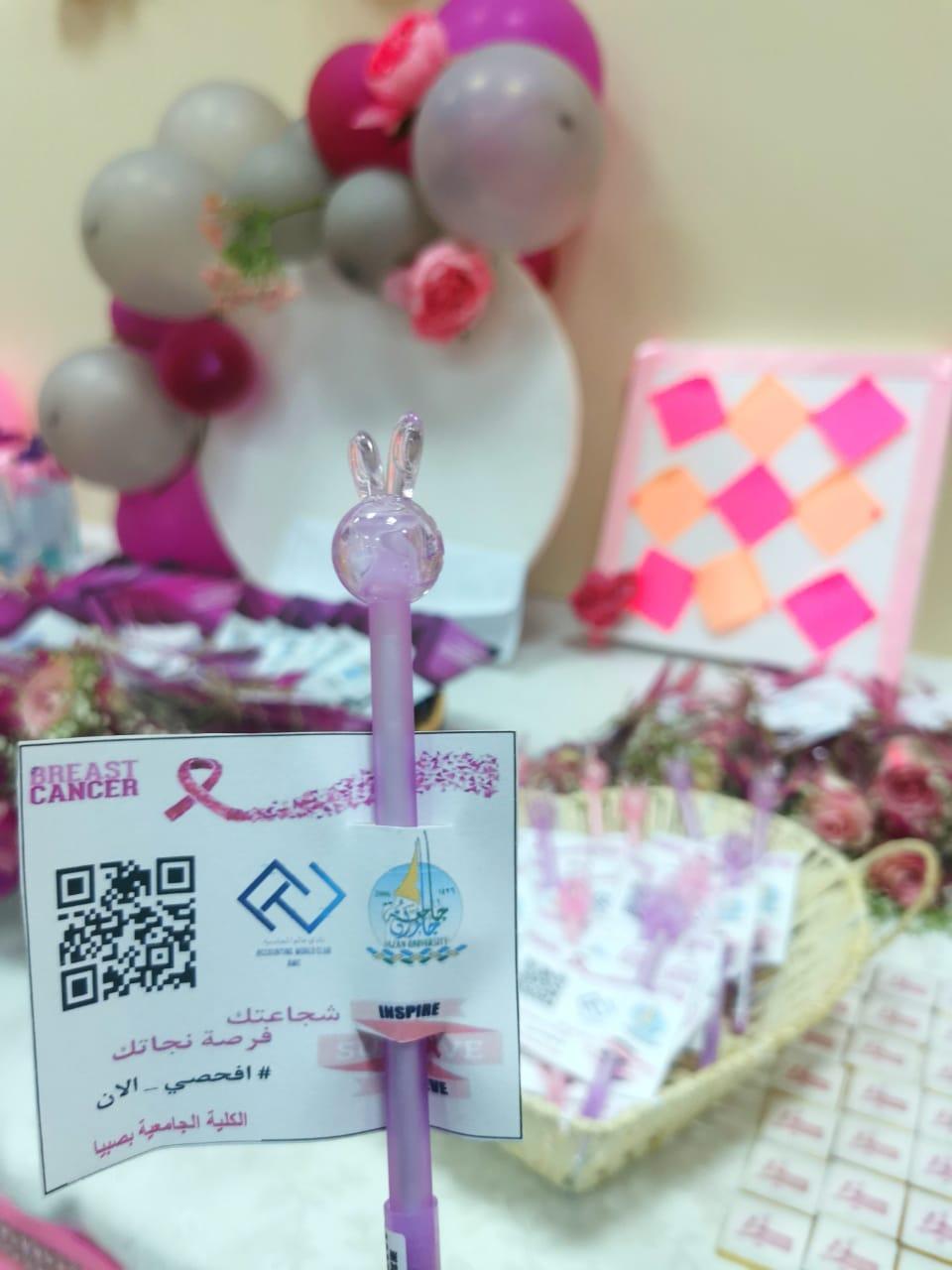 أقامت الكلية الجامعية بصبيا ممثلة في وحدة خدمة المجتمع بالتعاون مع وحدة النشاط الطلابي ونادي عالم المحاسبة وبالشراكة مع فريق قسم تقنية الاشعة الطبية التشخيصية بكلية العلوم الطبية التطبيقية فعالية توعوية عن الكشف المبكر عن سرطان الثدي تزامنا مع اليوم العالمي للوقاية من سرطان الثدي بشهر اكتوبر الوردي.