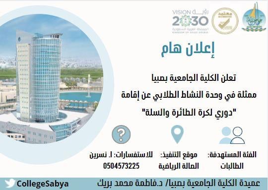 نظمت الكلية الجامعية بصبيا في الأسبوع الثامن من العام الدراسي 1442-1443 ممثلة بوحدة الأنشطة الطلابية "دوري لكرة الطائرة و السلة". بدأ الدوري بالإعلان عن الموعد والتسجيل في الفرق المشاركة حيث شاركت ثلاث من فرق من أقسام الكلية الثلاثة في كلا الدوريين.