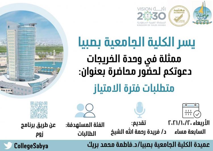 نظمت الكلية الجامعية بصبيا متمثلة بوحدة الخريجات بالتعاون مع وحدة شؤون الخريجين بجامعة جازان المحاضرة الأولى من سلسلة دورات وحدة الخريجات بعنوان: