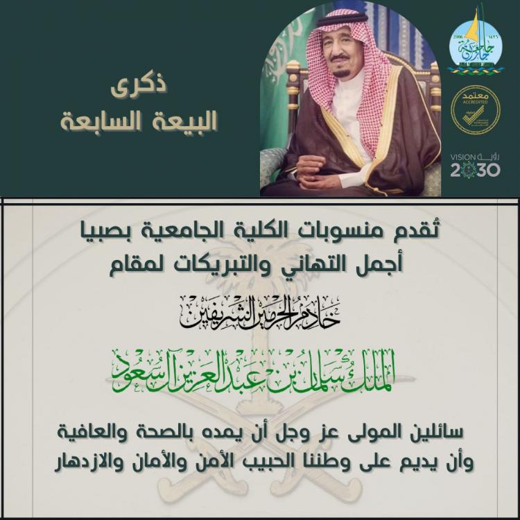 تُقدم منسوبات الكلية الجامعية بصبيا أجمل التهاني والتبريكات لمقام سيدي خادم الحرمين الشريفين الملك سلمان بن عبدالعزيز آل سعود -حفظه الله- بمناسبة ذكرى البيعة السابعة.