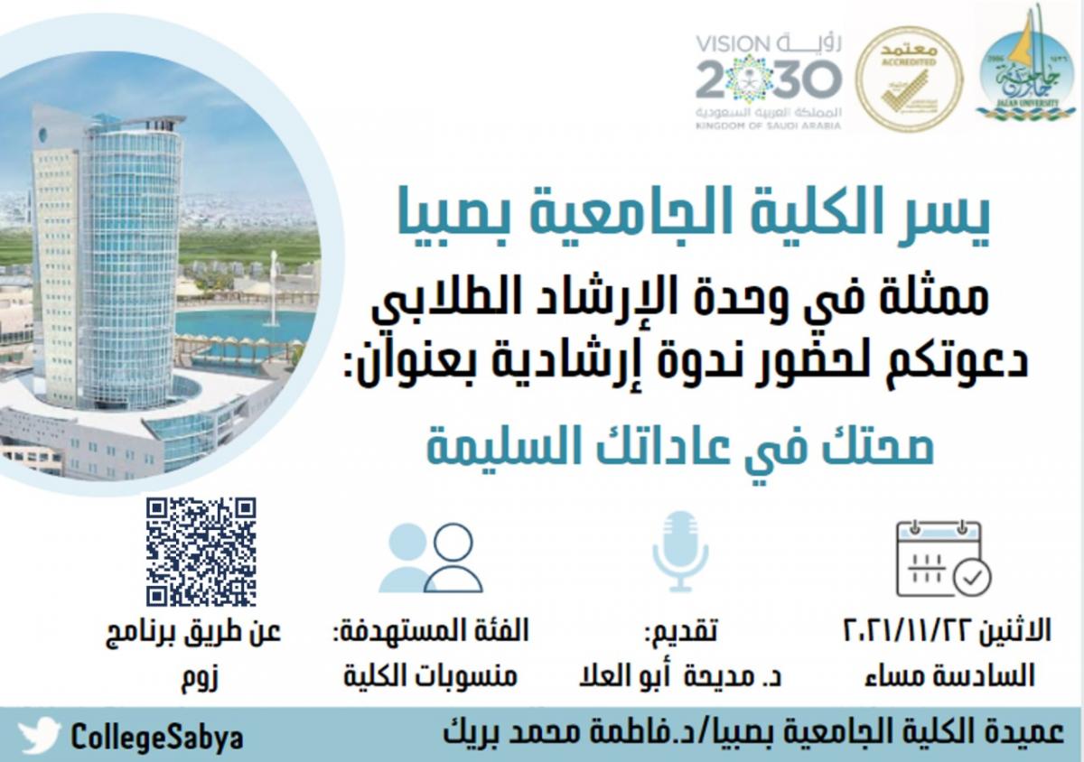نظمت الكلية الجامعية بصبيا متمثلةً بوحدة الإرشاد الطلابي ندوة إرشادية بعنوان” صحتك في عاداتك السليمة " من ضمن ندوات الإرشاد الصحي وذلك يوم الاثنين الموافق 22/١١/٢٠٢١. قدمتها د. مديحة علي أبوالعلا رئيسة وحدة الإرشاد الطلابي.