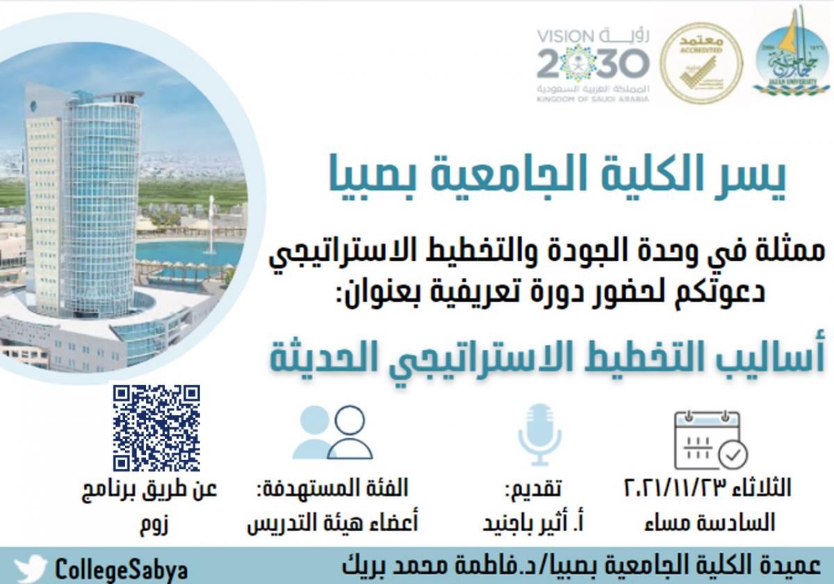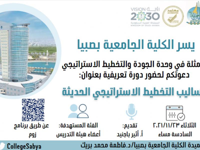 نظمت الكلية الجامعية بصبيا متمثلةً بوحدة الجودة والتخطيط الاستراتيجي دورة تعريفية بعنوان” أساليب التخطيط الاستراتيجي الحديثة" وذلك يوم الثلاثاء الموافق ٢٣/١١/٢٠٢١. قدمتها أ. أثير باجنيد من قسم الحاسب.