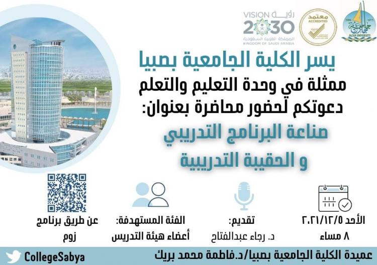 نظمت الكلية الجامعية بصبيا متمثلة بوحدة التعليم والتعلم محاضرة بعنوان صناعة برنامج تدريبي والحقيبة التدريبية يوم الأحد بتاريخ 5/12/2021 قدمتها رجاء عبد الفتاح محمد عبر تطبيق الزوم حيث تستهدف هذه الفعالية أعضاء هيئة التدريس وقد شهدت الدورة حضور عدد من أعضاء هيئة التدريس.