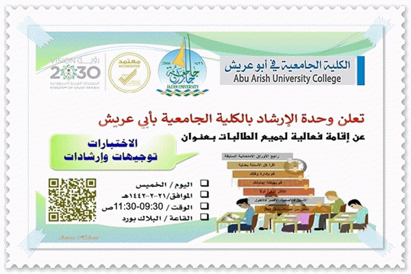 أقامت وحدة الإرشاد بالكلية الجامعية بمحافظة أبو عريش فعالية إرشادية بعنوان (الاختبارات ... توجيهات وإرشادات) استهدفت جميع الطالبات يوم الخميس الموافق 21-2-1442هـ عبر القاعة الإفتراضية بمنصة البلاك بورد من إعداد منسقة الوحدة أ. سهام الأمير وتنسيق سكرتيرة الوحدة أ. آمنة حكمي وتنفيذ مساعدة منسقة الوحدة م. نسرين عوض بحضور سعادة وكيلة الكلية للشؤون الأكاديمية د. الشيماء حمودة.