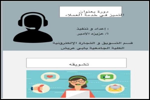 نظمت وحدة النشاط الطلابي بالكلية الجامعية بأبي عريش دورة التميز في خدمة العملاء برعاية عميدة الكلية د. آسيا الشيخ, ونفذت الدورة أ. عزيزة الأمير من قسم التسويق والتجارة الالكترونية عبر تطبيق البلاك بورد في يوم الخميس الموافق 1442/2/21هـ.