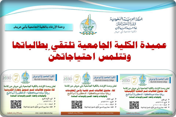 ولتقديم خدمات إرشادية أكاديمية ونفسية عالية الجودة أعدت وحدة الإرشاد هذه اللقاءات من بداية الفصل الدراسي الثاني (20212) بتنسيق منسقة الوحدة أ.سهام عايل الأمير ومساعدة الوحدة م. نسرين عوض الطاهر وتنظيم أ.آمنة جابر حكمي وحضور وكيلة الكلية للشؤون الأكاديمية د.الشيماءحمودة ووكيلة الكلية للتطوير م. نور العطاس و تنفيذ الأقسام الأكاديمية: رئيسة قسم التغذية الإكلينيكية د.عزة العريفي ومنسقة الإرشاد بالقسم أ.رؤى المغربي ورئيسة قسم تقنية وأمن المعلومات م. شابنا ماكنشيري ومنسقة الإرشاد بالقسم أ.شوق القحطاني ورئيسة قسم التسويق والتجارة الالكترونية ومنسقة الإرشاد بالقسم م. منى أبوغبرة مع أعضاء هيئة التدريس بالأقسام والوحدات المساندة.
