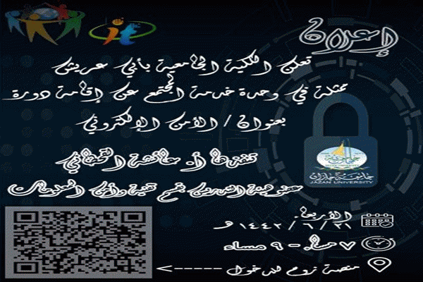 برعاية عميدة الكلية د / آسيا علي حيدر الشيخ وتحت اشراف منسقة وحدة خدمة المجتمع بالكلية م . هناء عبده دغريري نفذت الوحدة دورة تدريبية بعنوان " الأمن الإلكتروني " لمنسوبات وطالبات مدرسة متوسطة وثانوية السادلية , وذلك يوم الاربعاء الموافق 21/6/1442هـ من الساعة 7 حتى الساعة 9 مساءً عبر منصة زوم. قدمتها عضو هيئة التدريس بقسم تقنية وأمن المعلومات (عضو وحدة التعليم الإلكتروني بالكلية) أ. عائشة القحطاني .