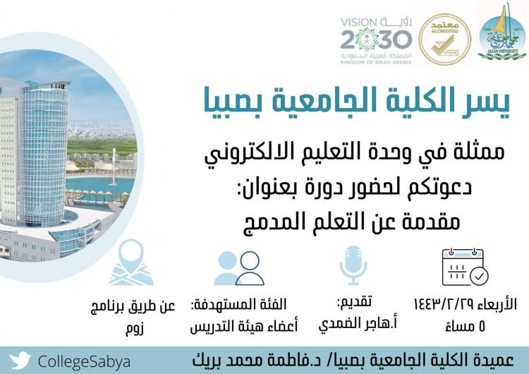 نظمت الكلية الجامعية بصبيا متمثلةً بوحدة التعليم الالكتروني دورة تدريبية بعنوان ” مقدمة عن التعلم المدمج ” يوم الأربعاء بتاريخ ٢٩/٢/١٤٤٣هـ قدمتها أ.هاجر الضمدي عبر تطبيق الزوم حيث تستهدف هذه الفعالية أعضاء هيئة التدريس.