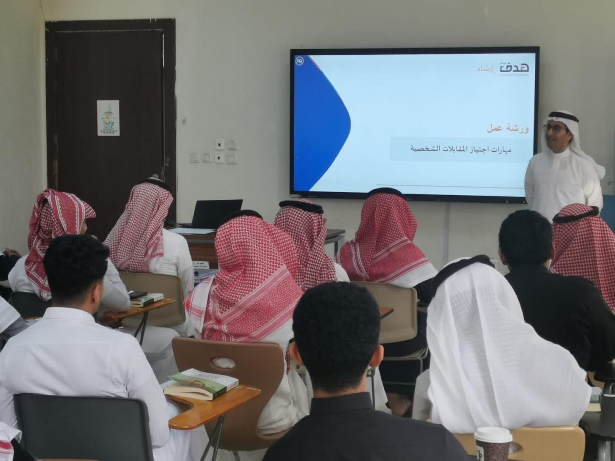 دورتين عن: السيرة الذاتية، والمقابلة الشخصية، مع التعريف بالإرشاد المهني حضر اللقاء مجموعة من الطلاب المتوقع تخرجهم 10/ 7/ 1445 هـ