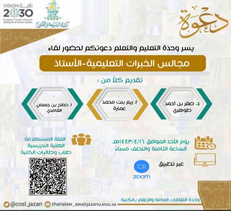 نظمت وحدة التعليم والتعلم بكلية الشريعة والقانون مجلسًا علميًّا، يهدف إلى عرض إبداعات عدد من أعضاء هيئة التدريس في كلية الشريعة والقانون في استراتيجيات التدريس، ونقْل هذه الإبداعات إلى أعضاء هيئة التدريس الآخرين، لإيجاد بيئة شاملة ومتكاملة تطبق استراتيجيات التدريس الحديثة وصولاً لتحقيق مخرجات التعلم، بما يسهم في تحقيق أهداف رؤية 2030،