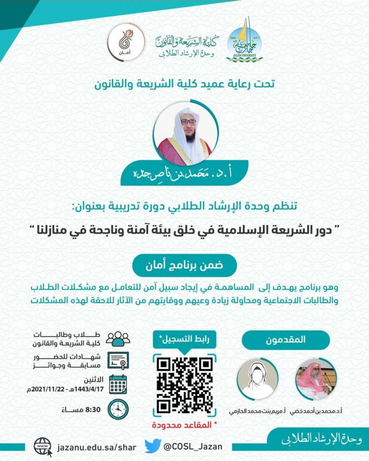 نفذت وحدة الإرشاد الطلابي بكلية الشريعة والقانون دورة تدريبية بعنوان دور الشريعة في خلق بيئة ناجحة وآمنة في منازلنا ضمن برنامج أمان الذي يساهم في إيجاد سبيل آمن للتعامل مع مشكلات الطلاب والطالبات الاجتماعية ووقايتهم من آثار هذه المشكلات وهو أحد محاور الإرشاد الاجتماعي تناول الدورة في جزئها الأول فضيلة أ.د محمد بن أحمد خضي أهمية الإيمان في حياة المسلم، ثم ذكر الأسس والمبادئ التي تحقق الأمن والطمأنينة التي جاء على رأسها التوحيد بالله والاستغفار ثم المحافظة على الصلاة وقراءة القرآن، وإقامة بقية الفرائض كالزكاة والصيام والحج، ودعى إلى ضرورة المحافظة على الأذكار المشروعة والحرص على إتباع سنة نبينا محمد صلى الله عليه وسلم، ثم حذر من ارتكاب المعاصي والمنكرات وتناولت المحاضرة مريم المهدي الجزء الثاني كالتعريف بأسس الاستقرار الأسري وثماره وعن الأمن النفسي وخصائصه قبل الحاجات الجسدية، وكيفية تحقيقه في منازلنا من إشباع الحاجات النفسية للأبناء، وأن إهمال ذلك قد يؤثر على صحتهم وسلوكهم.