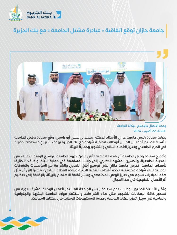 جامعة جازان توقع اتفاقية "مبادرة مشتل الجامعة" مع بنك الجزيرة