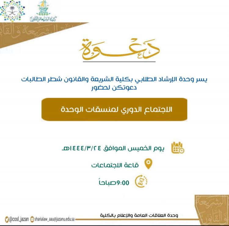 نفذت منسقة وحدة الإرشاد الطلابي المحاضرة تهاني فلقي عضو هيئة التدريس بكلية الشريعة والقانون شطر الطالبات الاجتماع الدوري الأول