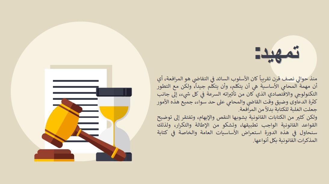 ولكن كثير من الكتابات القانونية يشوبها النقص والإبهام، وتفتقر إلى توضيح القواعد القانونية الواجب تطبيقها، وتشكو من الإطالة والتكرار، لذلك تم استعراض الأساسيات العامة والخاصة في كتابة المذكرات القانونية بكل أنواعها.