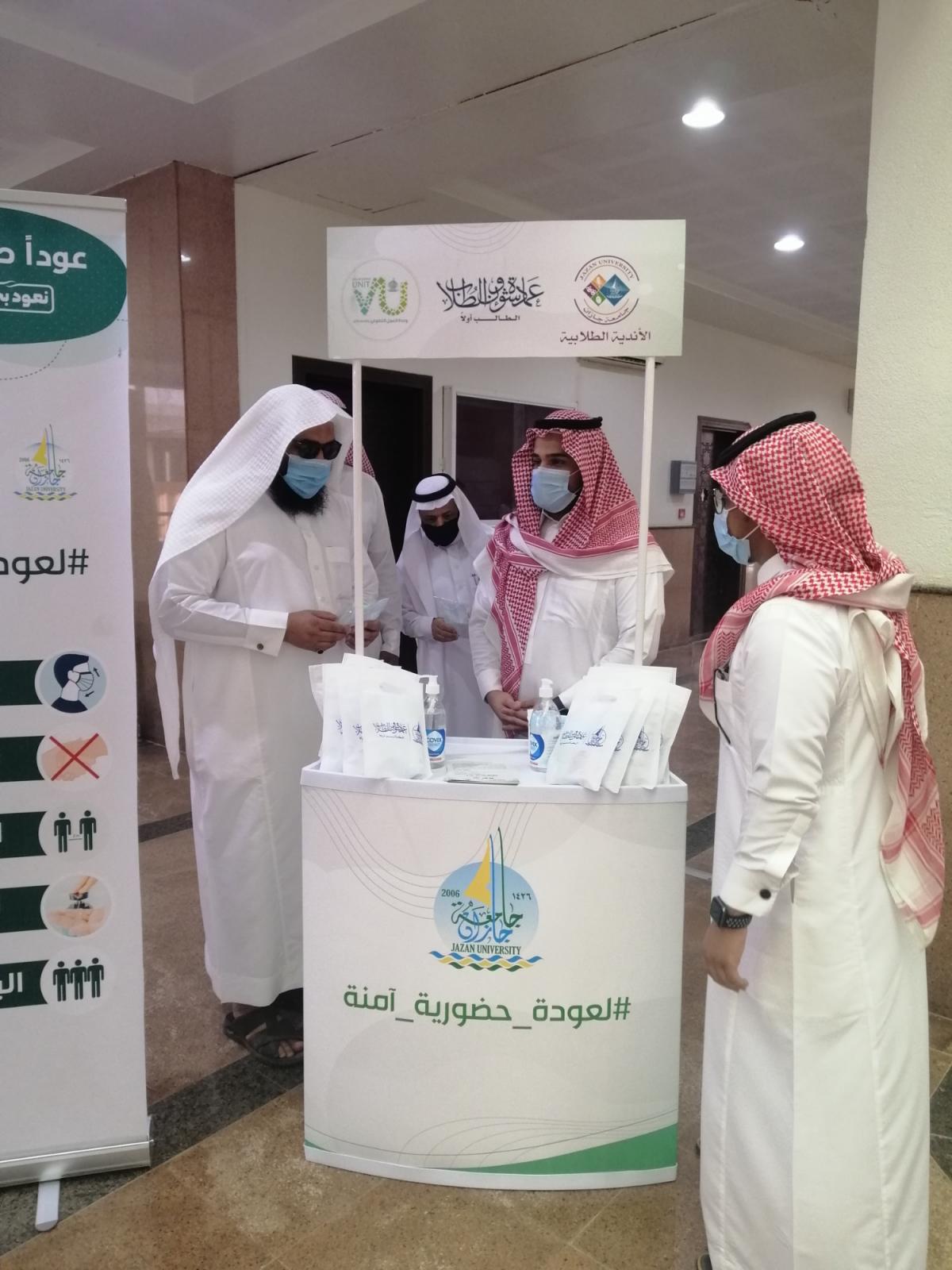 و ما قامت به الكلية من جهود احترازية للعودة الآمنة للدراسة الحضورية ، حيث الالتزام بالفرز البصري ولبس الكمامة و ترتيب القاعات و تعقيمها وتطبيق التباعد الوقائي ما بين أماكن جلوس الطلاب ،وذلك لضمان سلامة الطلاب وأعضاء هيئة التدريس والموظفين