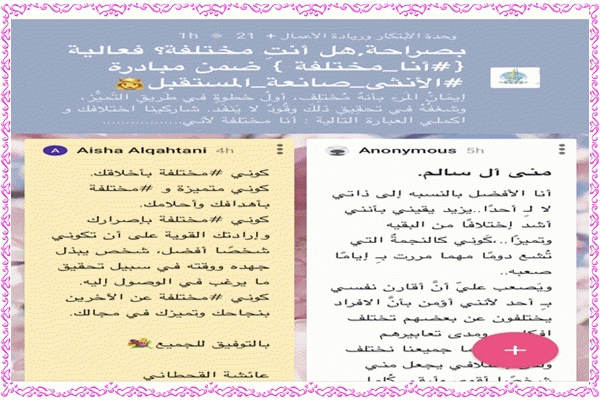 ضمن مبادرة الأنثى صانعة للمستقبل أطلقت وحدة الابتكار وريادة الأعمال ممثلة بمنسقة الوحدة م.منى يحي أبو غبرة فعالية (أنا مختلفة) على صفحة البادلت وذلك ابتداء من مساء يوم السبت 1442/03/07هـ ولمدة اسبوعين، لجذب الطالبات ولفت انتباههن نحو وحدة الابتكار وريادة الأعمال حيث اتاحت للطالبات فرصة التعبير عن اختلافاتهن كمتنفس لهن للتعبير وكوسيلة للتقليل من ضغوطات الاختبارات الفصلية .
