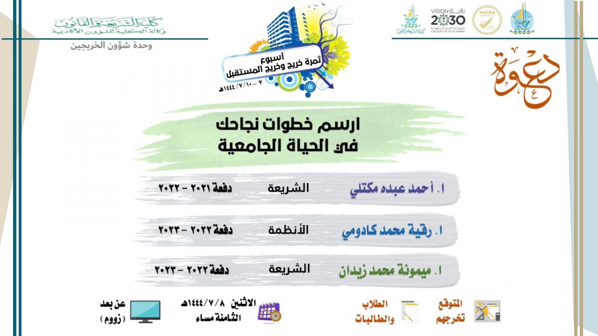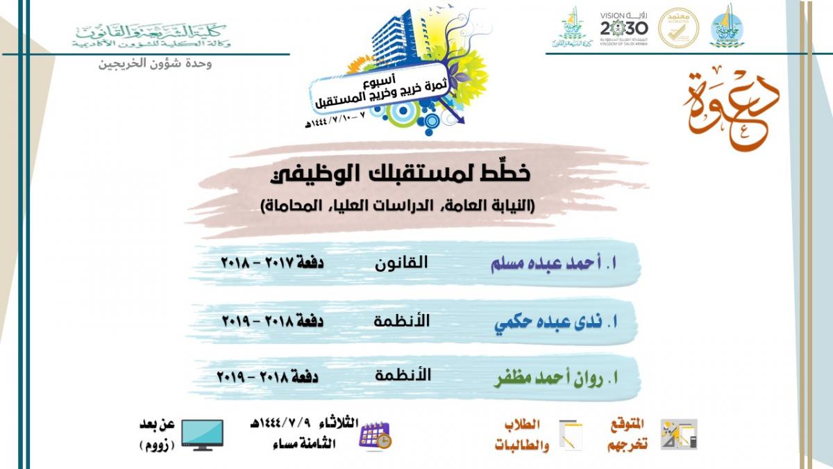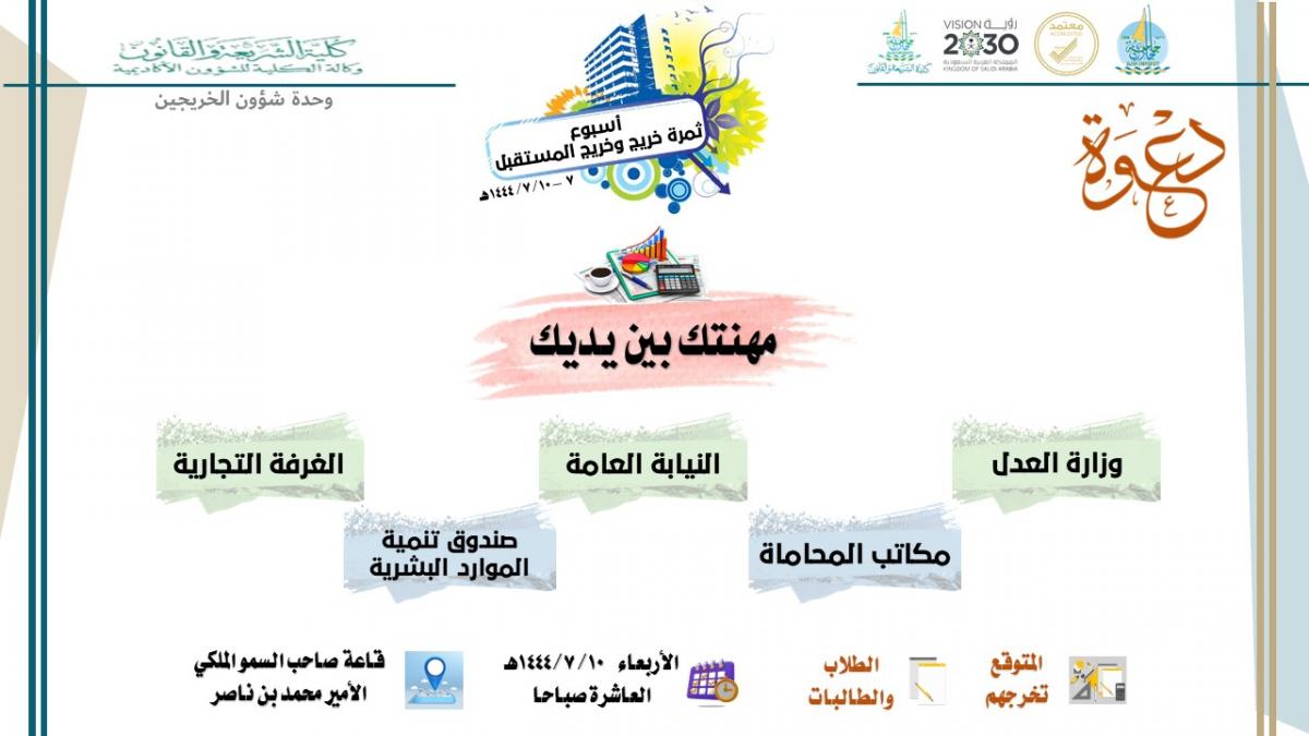 وتقام خلال الأسبوع: لقاءات معرفية مهارية مع خريجي وخريجات الكلية، ولقاء مع جهات التوظيف.