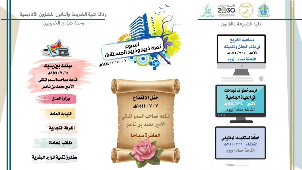 برعاية كريمة من معالي رئيس جامعة جازان الأستاذ الدكتور مرعي بن حسين القحطاني تنظم كلية الشريعة والقانون أسبوع "ثمرة خريج وخريج المستقبل