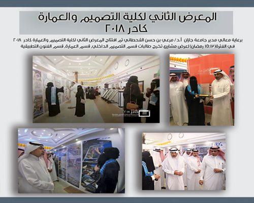 برعاية معالي مدير جامعة جازان أ.د/ مرعي بن حسن القحطاني تم افتتاح المعرض الثاني لكلية التصميم والعمارة كادر ٢٠١٨ في الفترة(١٥:١٣ رمضان) لعرض مشاريع تخرج طالبات قسم التصميم الداخلي٬ قسم العمارة٬ قسم الفنون التطبيقية .