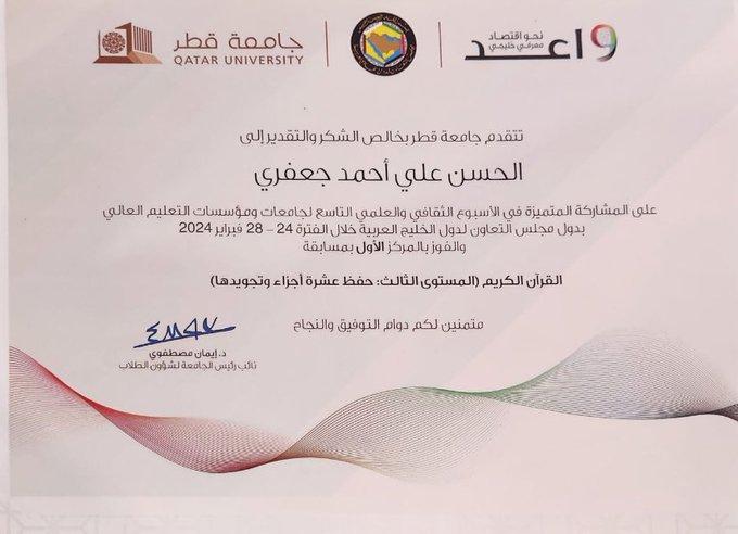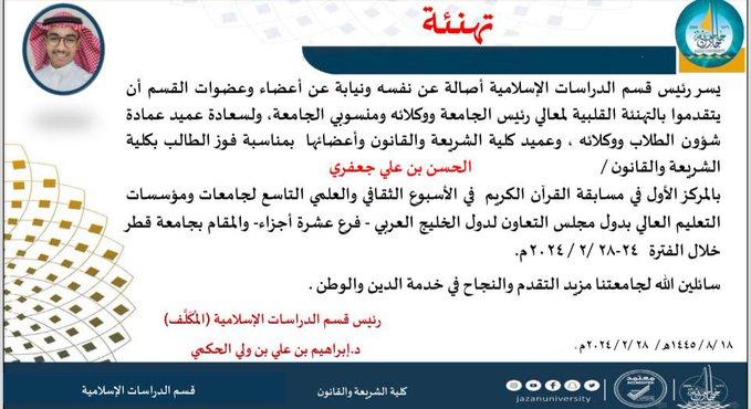 يسر رئيس قسم الدراسات الإسلامية أصالة عن نفسه ونيابة عن أعضاء وعضوات القسم أن يتقدموا بالتهنئة القلبية لمعالي رئيس الجامعة ووكلائه وعميد #كلية_الشريعة_والقانون وعميد شؤون الطلاب بمناسبة فوز الطالب في كلية الشريعة/ الحسن بن علي جعفري بالمركز الأول في مسابقة القرآن الكريم في الأسبوع الثقافي والعلمي التاسع لجامعات ومؤسسات التعليم العالي بدول مجلس التعاون لدول الخليج العربي فرع عشرة أجزاء .