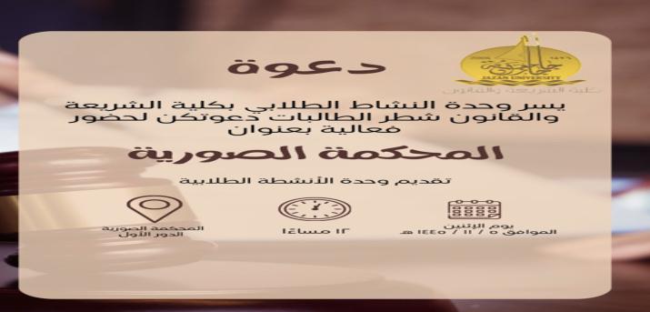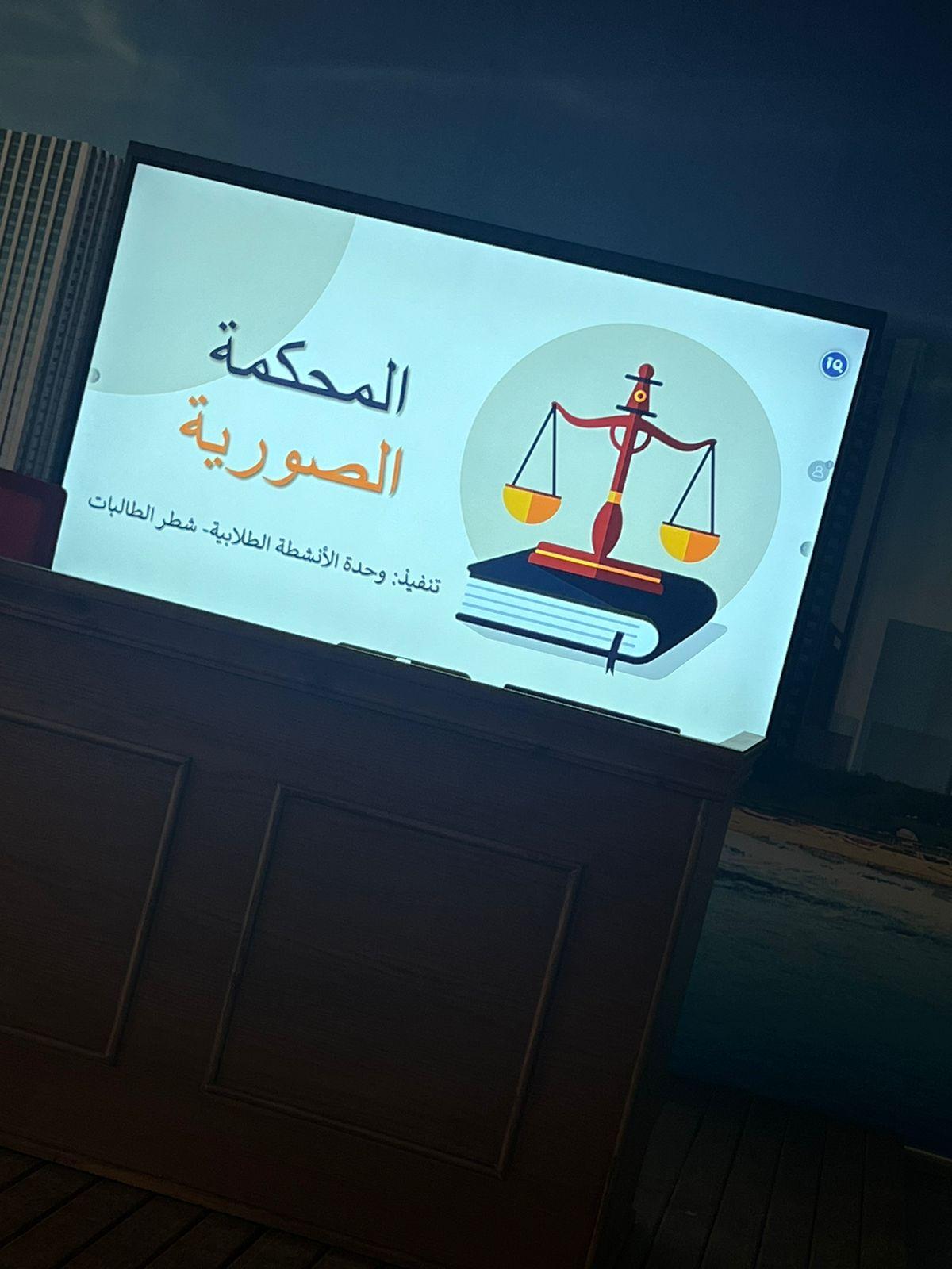 نفذت وحدة الأنشطة الطلابية بالتعاون مع طالبات كلية الشريعة والقانون، فعالية بعنوان المحكمة الصورية، والتي تناولت تمثيل مرافعة افتراضية عن قضية تحكمية تتعلق بعقد بيع بدلات فضائية، وقد قسمت المرافعة إلى أربعة أقسام، تناول القسم الأول ذكر نبذة مختصرة عن موضوع القضية والوقائع التي نشأ عنها النزاع بين المحتكمة والمحتكم ضدها، تلى ذلك استعراض المشكلة القانونية الأولى (القسم الثاني)، والذي تعين على أطراف النزاع الرد عليها، ثم عرضت المشكلة القانونية الثانية (القسم الثالث)، وتم تمكين ممثلي أطراف الخصومة من الرد عليها ايضا، أخيرا، انتهت المرافعة الافتراضية برفع الدعوى للتداول وإصدار الحكم النهائي في النزاع من لجنة التحكيم