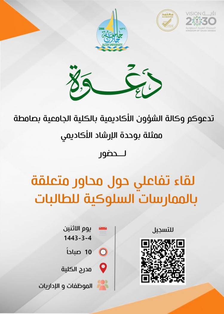 نظمت الكلية الجامعة بصامطة ممثلةً بوحدة الإرشاد الأكاديمي (لقاء تفاعلي حول محاور متعلقة بالممارسات السلوكية للطالبات). وأدار اللقاء منسقة وحدة الإرشاد الأكاديمي بالكلية أ. أميرة حكمي. استهدفت في هذا اللقاء الكادر الإداري ومراقبات الأمن بالكلية. عرض في هذا اللقاء الأخلاقيات التي ينبغي أن تتحلى بها الطالبة في الكلية أثناء سير العملية التعليمية، وتم مناقشة بعض الممارسات والسلوكيات الخاطئة التي تصدر من بعض الطالبات.